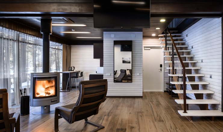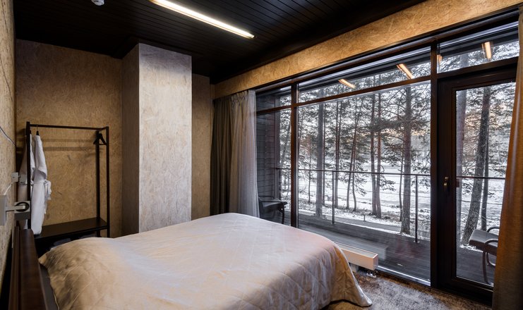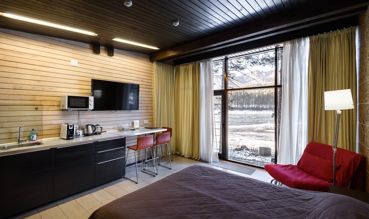 В номере: вешалка, кресло-кровать, кровать двуспальная, обувная полка, прикроватные тумбочки, стулья, Мини-кухня, кофемашина, микроволновая печь, мини-холодильник, сейф, телевизор ЖК, телефон, чайный набор посуды, электрочайник