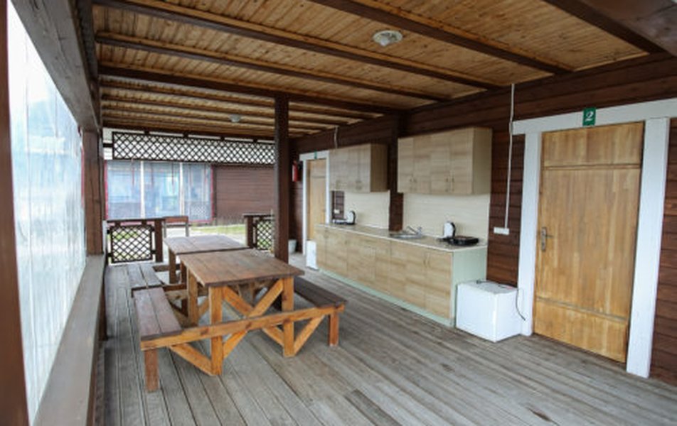 В домике: кровати односпальные, кухонная мебель, прикроватные тумбочки, стол, стулья, мини-кухня, мини-холодильник, набор посуды, плита электрическая, телевизор, электрочайник