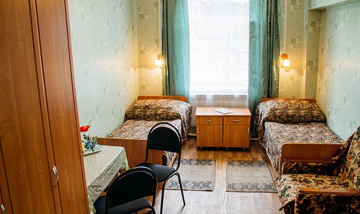 Оснащение номера: две односпальные кровати, прикроватные тумбочки, стол, стулья, кресло, шкаф для одежды, зеркало, телевизор, утюг, электрочайник, холодильник ( в холле)