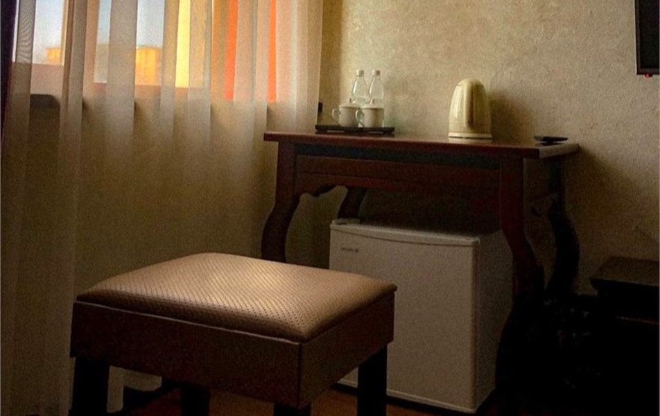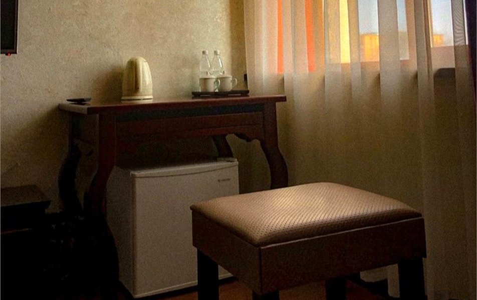 В номере: кровать двуспальная, прикроватные тумбочки, стол, стулья, шкаф, кондиционер, мини-холодильник, телевизор, чайный набор посуды, электрочайник