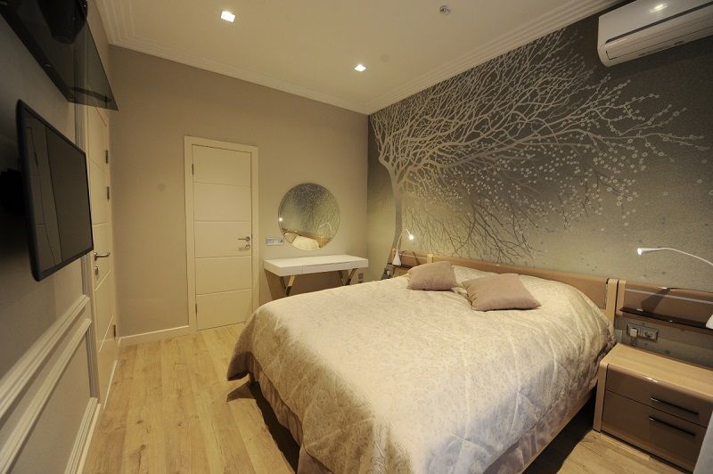 В номере: две комнаты: спальня и гостиная с кухней, кровати односпальные /одна двуспальная кровать, прикроватные тумбочки, стол, стулья, шкаф, мягкая мебель, обеденный гарнитур, кондиционер, микроволновая печь, набор посуды, телевизор, холодильник, электрочайник