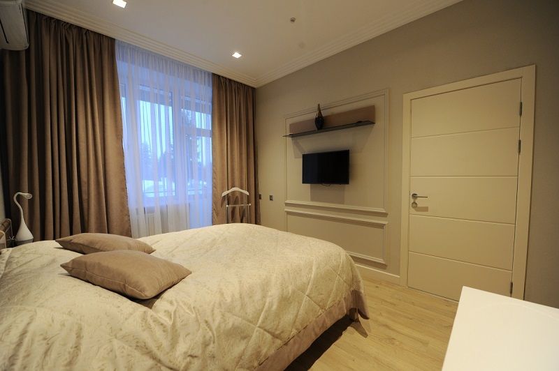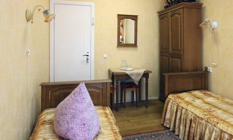В номере: кровати односпальные, прикроватные тумбочки, стол, стулья, шкаф, набор посуды, телевизор, холодильник