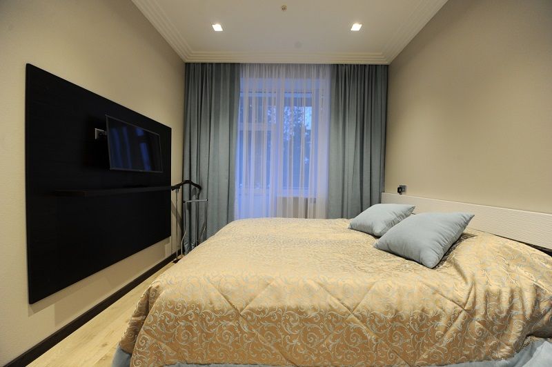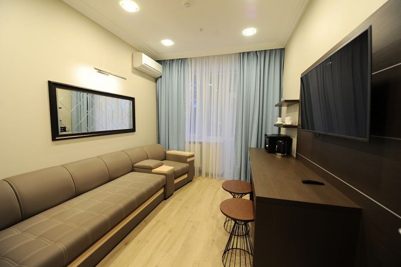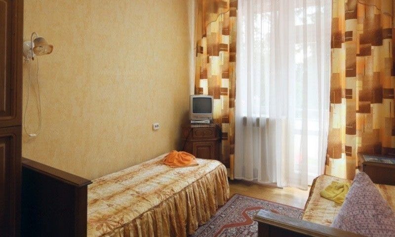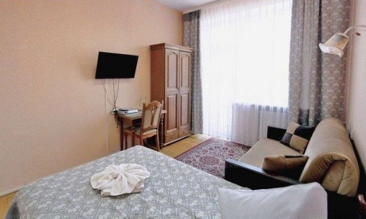 В номере: односпальная кровать, прикроватная тумбочка, стол, стул, шкаф, диван, телевизор, холодильник
