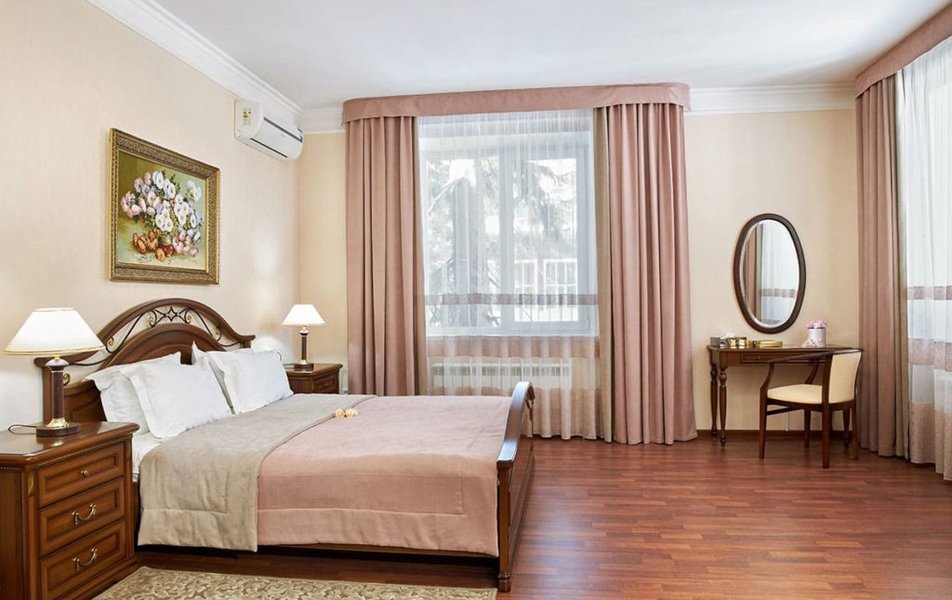 В номере: вешалка, диван, зеркало, кровать двуспальная, прикроватные тумбочки, стол, столик журнальный, стулья, шкаф, сейф, телевизор ЖК, телефон, холодильник, чайный набор посуды, электрочайник
