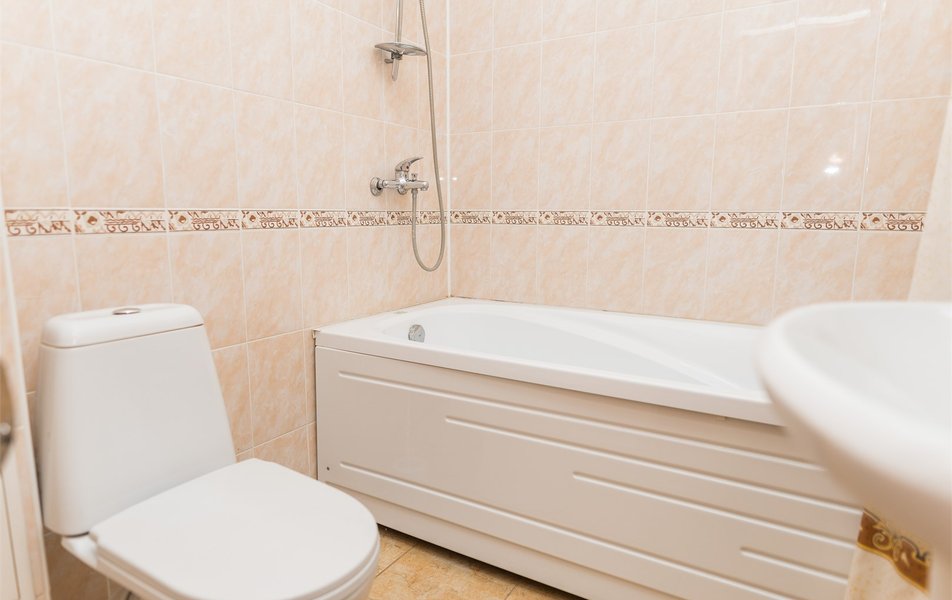 Санузел: ванна, раковина, унитаз, тапочки, туалетные принадлежности, фен, халат