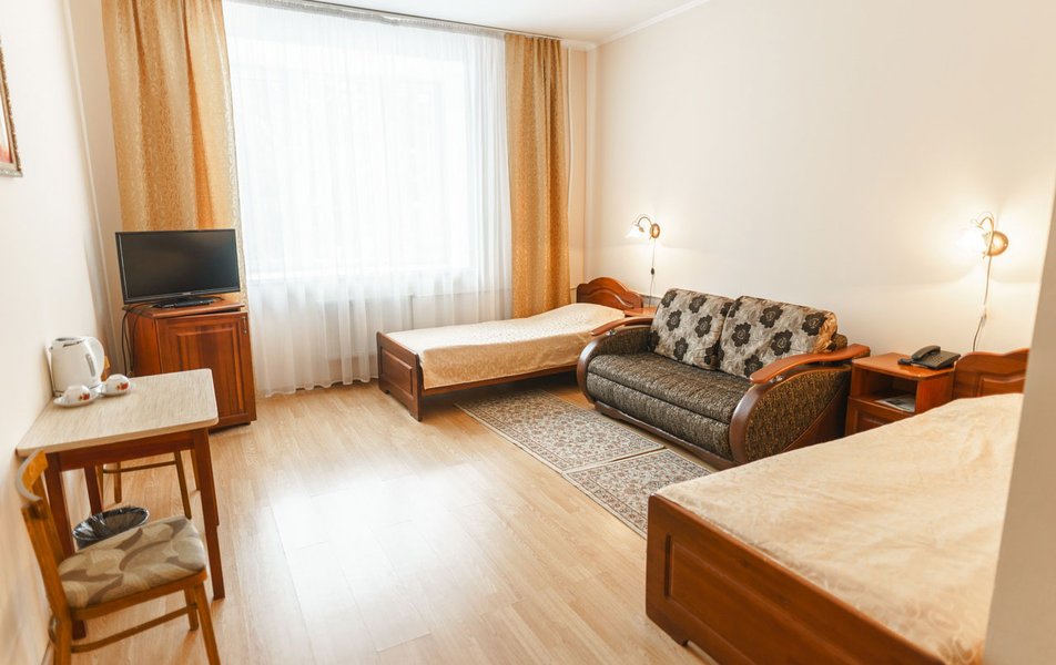 В номере: вешалка, кровати односпальные, прикроватные тумбочки, стол, столик журнальный, стулья, шкаф, сейф, телевизор ЖК, телефон, холодильник, чайный набор посуды, электрочайник