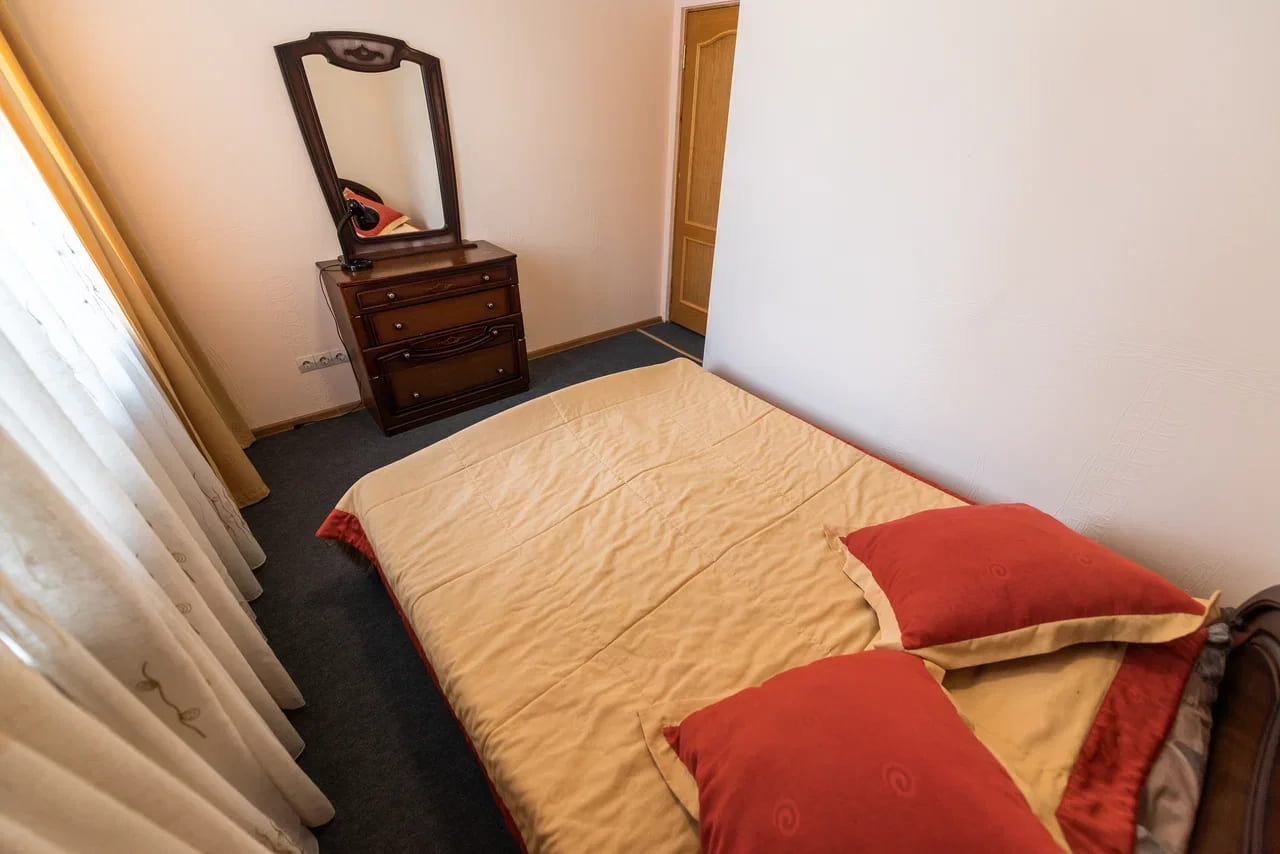 Оснащение номера: две односпальные кровати, прикроватная тумбочка, стол, стулья, шкаф, комод, диван, журнальный стол, телевизор, холодильник, чайный набор посуды, электрочайник
