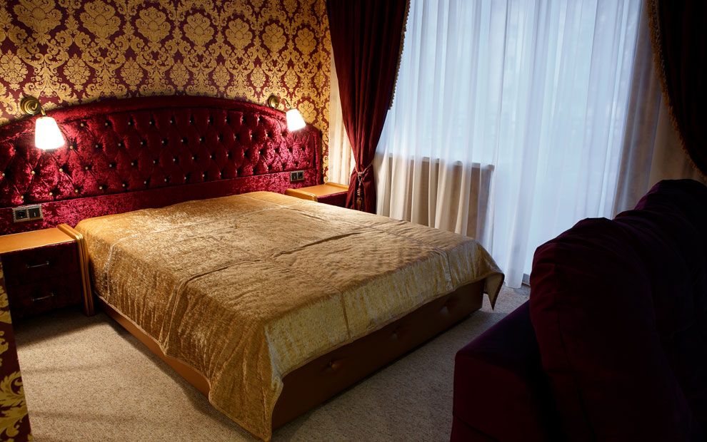 В номере: двуспальная кровать, прикроватные тумбы, стол, стул, шкаф, мягкая мебель, журнальный столик, телевизор, холодильник, чайник, набор посуды