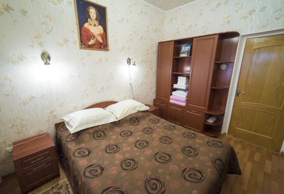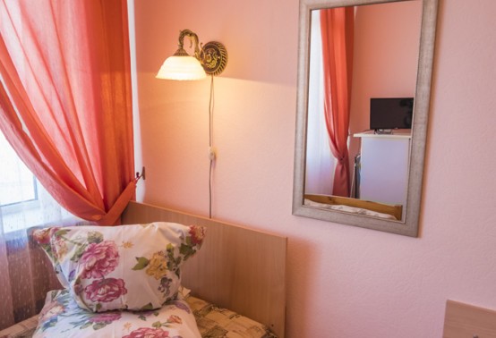 В номере: полутораспальная кровать, прикроватная тумбочка, встроенный шкаф, стол, кресло, телевизор, холодильник, телефон, набор посуды